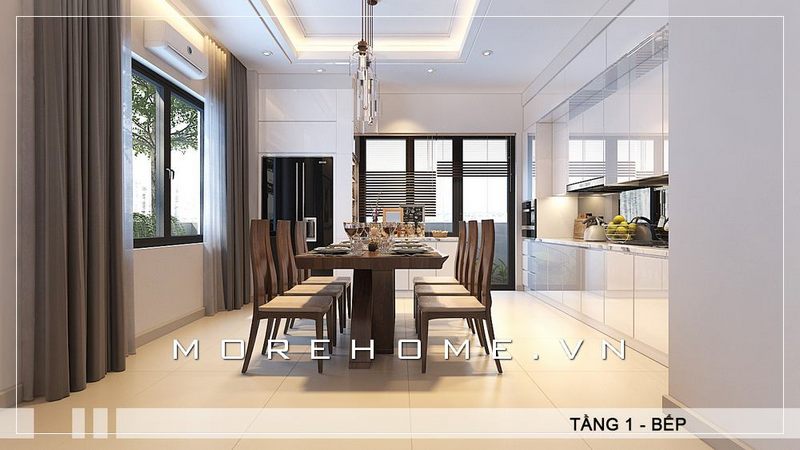 Cách bố trí nội thất phòng ăn liền bếp mang nét ấn tượng bởi sự ngăn nắp và khoa học. Bộ bàn ăn hiện đại được đặt ngay giữa phòng tạo sự thông thoáng và cao cấp.