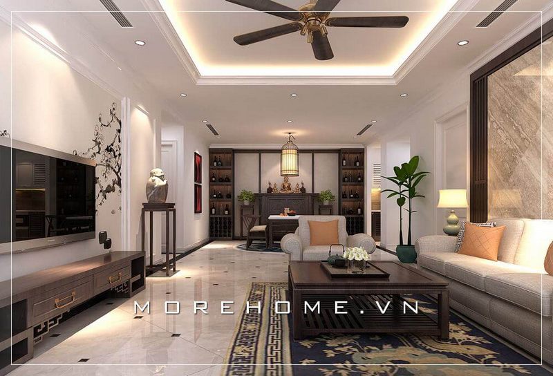 Thiết kế nội thất phòng khách đương đại có bàn thờ đẹp, sang trọng cho căn hộ chung cư.