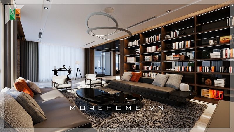 Tủ sách cao cấp từ chất liệu gỗ óc chó quý giá như một vách ngăn hiện đại của phòng khách biệt thự, nhà phố