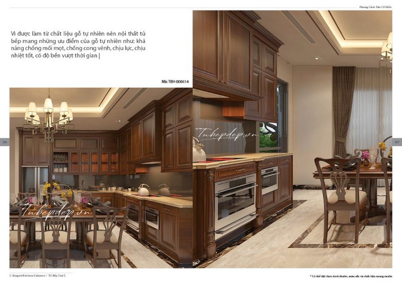 . Bàn ăn thường được đặt trong phòng bếp để tăng sự thuận tiện trong sinh hoạt. Từ tủ bếp đến bàn ăn đều được sơn bóng tự nhiên, tạo nên một phong cách tân cổ điển sang trọng.